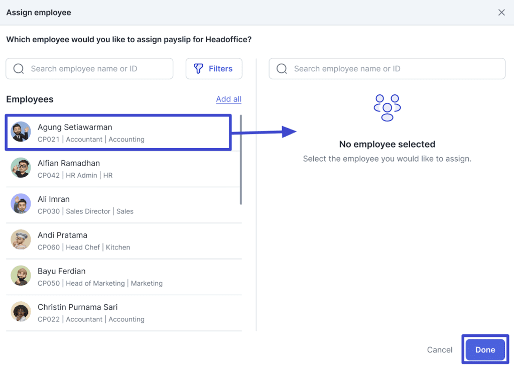 4. Pada sidebar yang muncul, klik nama-nama karyawan yang ada di daftar bagian kiri hingga mereka berpindah ke daftar bagian kanan. Kemudian, klik “Done”.