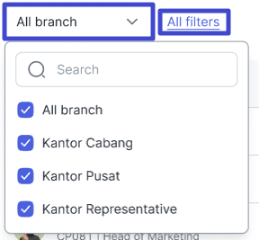 – Anda dapat memfilter daftar nama karyawan terpilih berdasarkan Branch atau All filters (Seluruh filter).