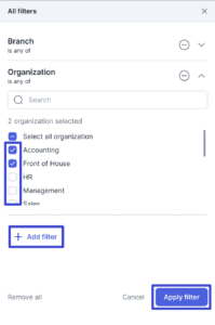 – Maka, Anda akan diarahkan ke jendela filter yang lebih rinci. Anda dapat menambahkan filter dengan klik “Add filter” berdasarkan banyak kategori, seperti branch, organization, job position, dsb. Lalu, mencentang tipe-tipenya satu per satu. Klik “Apply filter” untuk menerapkan filter.