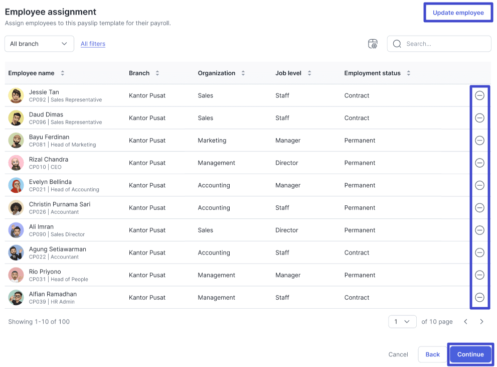 Anda dapat memanfaatkan Search bar untuk mencari nama karyawan tertentu. Atau, “Filter” untuk memfilter karyawan berdasarkan kategori tertentu.5. Nama-nama karyawan yang muncul akan terdaftar di bagian Employee assignment. Anda dapat memastikan nama-nama yang terpilih sudah sesuai. Apabila terdapat ketidaksesuaian, klik ikon “-” untuk menghapus nama. Atau “Update employee” untuk menambahkan atau mengurangi nama karyawan lainnya. Klik “Continue” untuk pergi ke halaman selanjutnya.