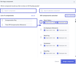 2 Employee information Anda dapat menentukan informasi karyawan mana saja yang ditampilkan di payslip dengan mengaktifkan atau menonaktifkan toggle Displayed pada masing-masing informasi. 3 Set earnings component Klik untuk menentukan komponen-komponen pendapatan apa saja yang ditampilkan di payslip. Maka, pop-up berikut muncul. Anda dapat memilih List of components di kolom kiri agar berpindah ke list selected di kanan. – Search bar: Untuk mencari component pada masing-masing kolom.