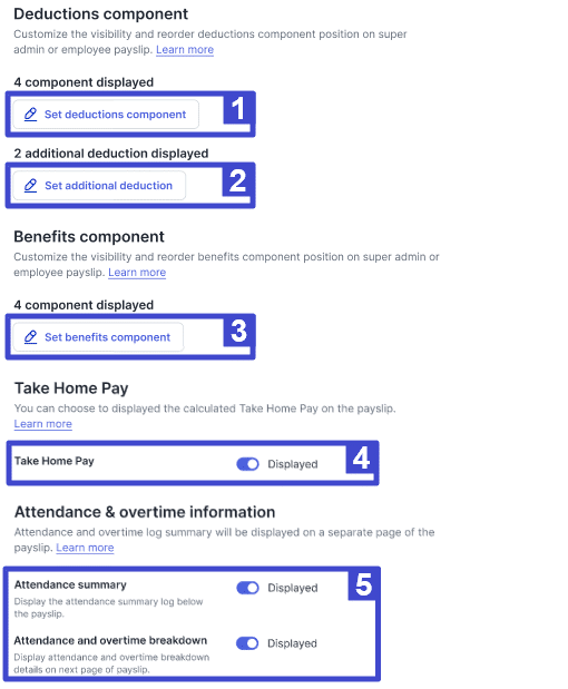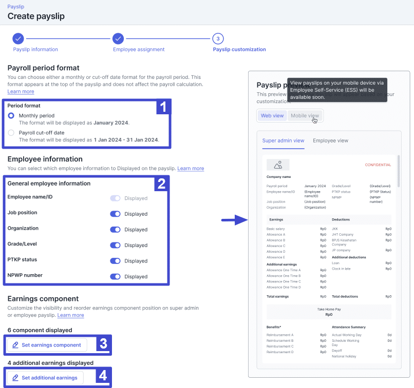 Set earnings component keterangan langkah ke 6.3 Set benefits component Klik untuk memilih komponen-komponen benefit apa saja yang ditampilkan di payslip. 4 Take Home Pay Anda dapat menentukan apakah THP ditampilkan di payslip atau tidak dengan