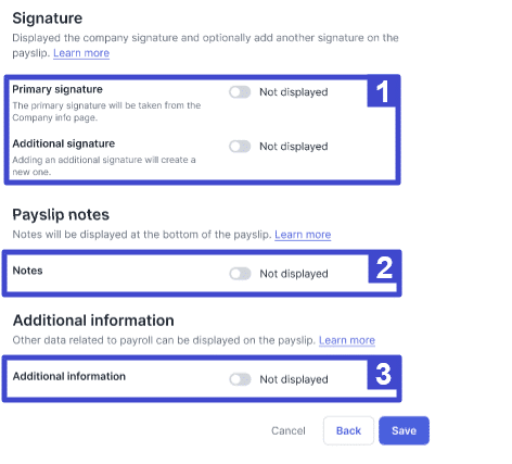 2 Payslip notes Klik untuk menampilkan notes pada payslip dengan mengaktifkan atau menonaktifkan toggle Displayed. 3 Additional information Klik untuk mengaktifkan atau menonaktifkan toggle Displayed Notes. 9. Jika template sudah sesuai, klik “Save” untuk menyimpannya.