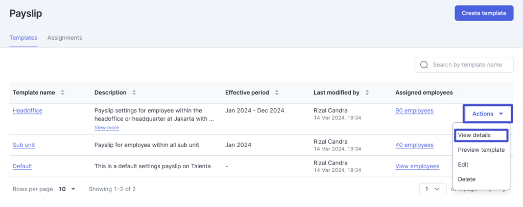 - Pada halaman Payslip Setting, Anda dapat melihat rincian Payslip template yang telah Anda buat sebelumnya. Klik “Actions” lalu klik “View details”.