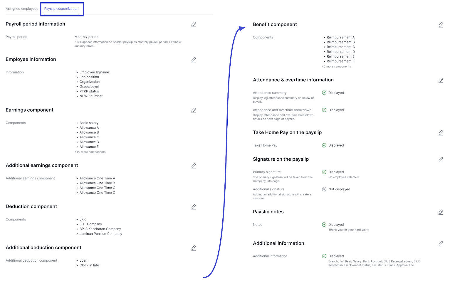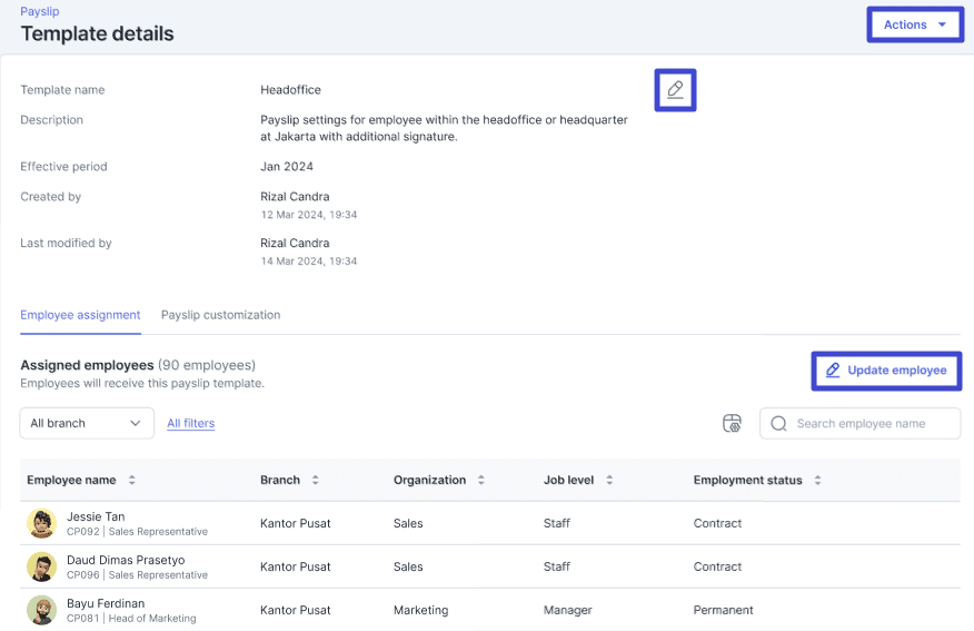 – Klik “Update employee” untuk mengubah nama-nama karyawan yang di-assign atau mendapatkan payslip ini. - Anda dapat klik tab Payslip Customization untuk mengubah kustomisasi informasi apa sajakah yang akan ditampilkan ke payslip template ini. Pada setiap bagian dari payslip, dapat Anda ubah informasinya dengan klik ikon “pensil” pada masing-masing templatenya.