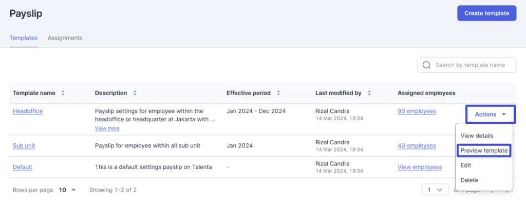 - Pada halaman Payslip Setting, Anda dapat melihat preview Payslip template yang telah Anda buat sebelumnya. Klik “Actions” lalu klik “Preview template”.