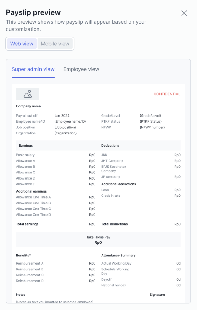 - Maka, pop-up Payslip preview muncul. Anda dapat melihat tampilan Payslip template dari Point of View Super admin atau Employee dengan klik tab yang sesuai.
