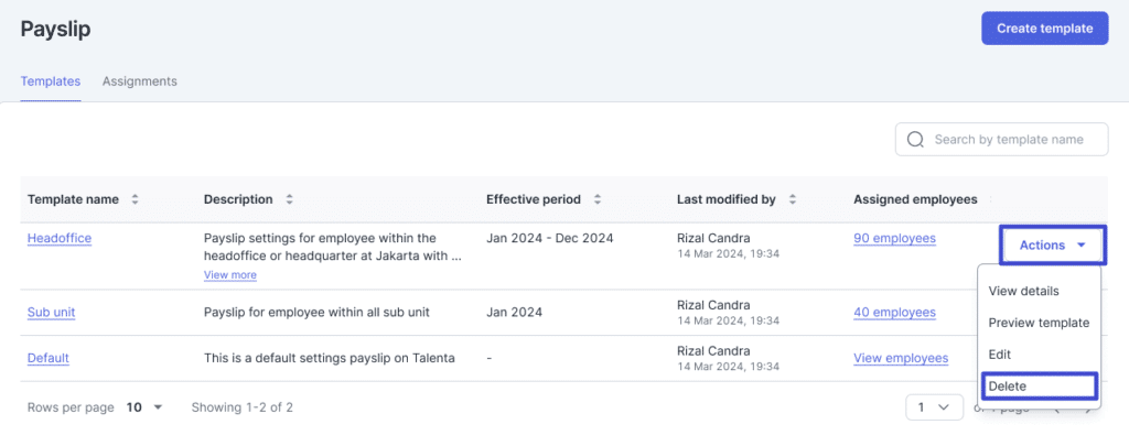 - Selain itu, Anda juga dapat menghapus Payslip template yang telah dibuat dengan klik “Actions” lalu Delete.