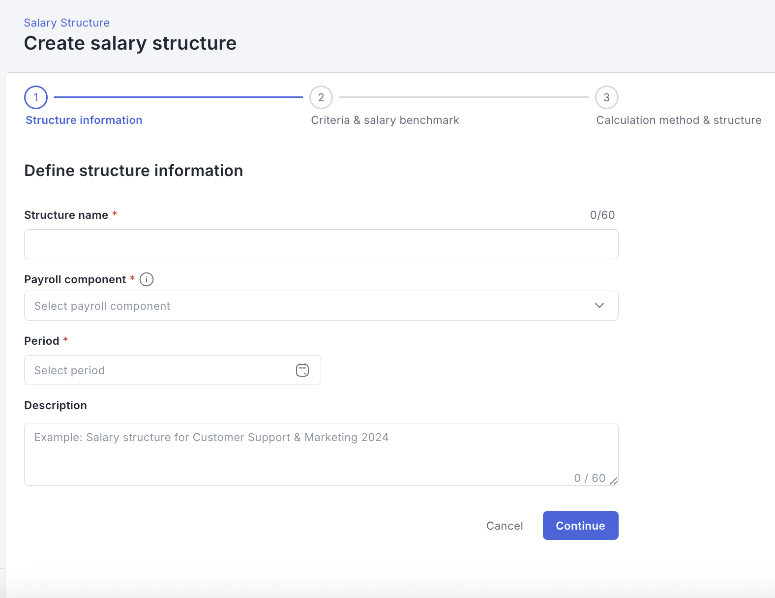 Masukkan nama struktur gaji, pilih komponen (basic salary, allowance, benefits, dll), tentukan periode payroll, dan tambahkan deskripsi jika diperlukan.