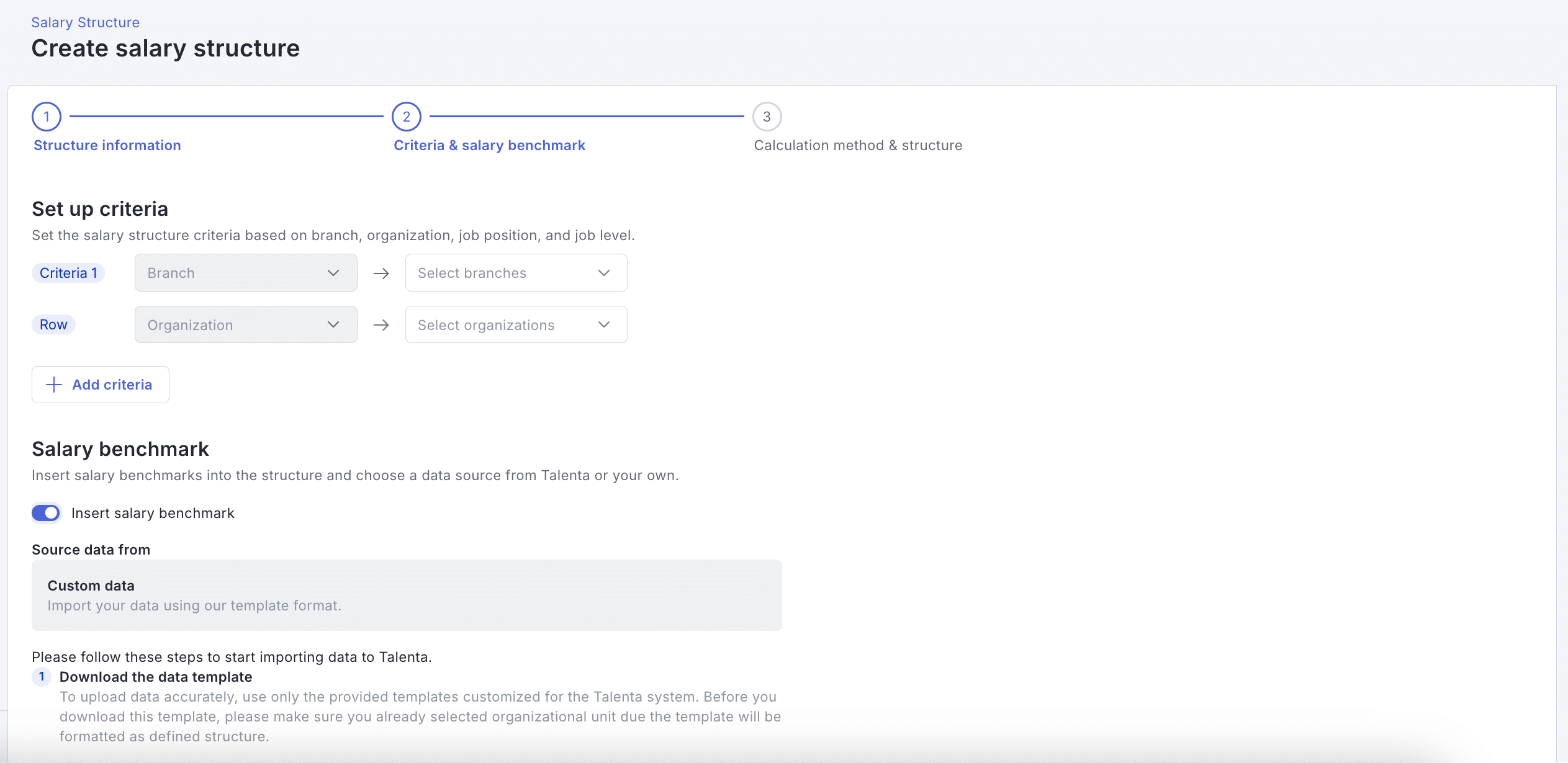 Tentukan kriteria seperti Branch dan Organization, lalu tambahkan kriteria lain jika diperlukan. Anda juga bisa menggunakan fitur Salary Benchmark dengan upload template data.