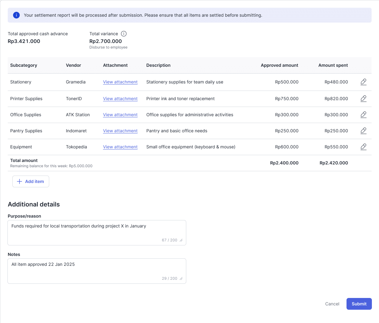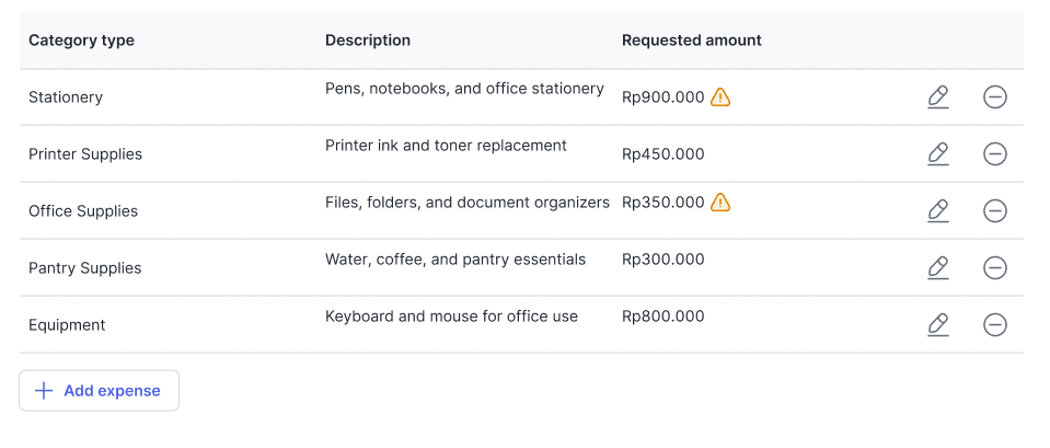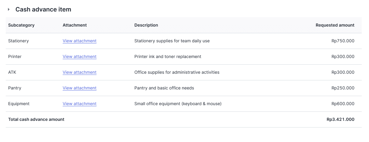 Sebagai contoh, tim operasional mengajukan cash advance untuk pembelian perlengkapan kantor.