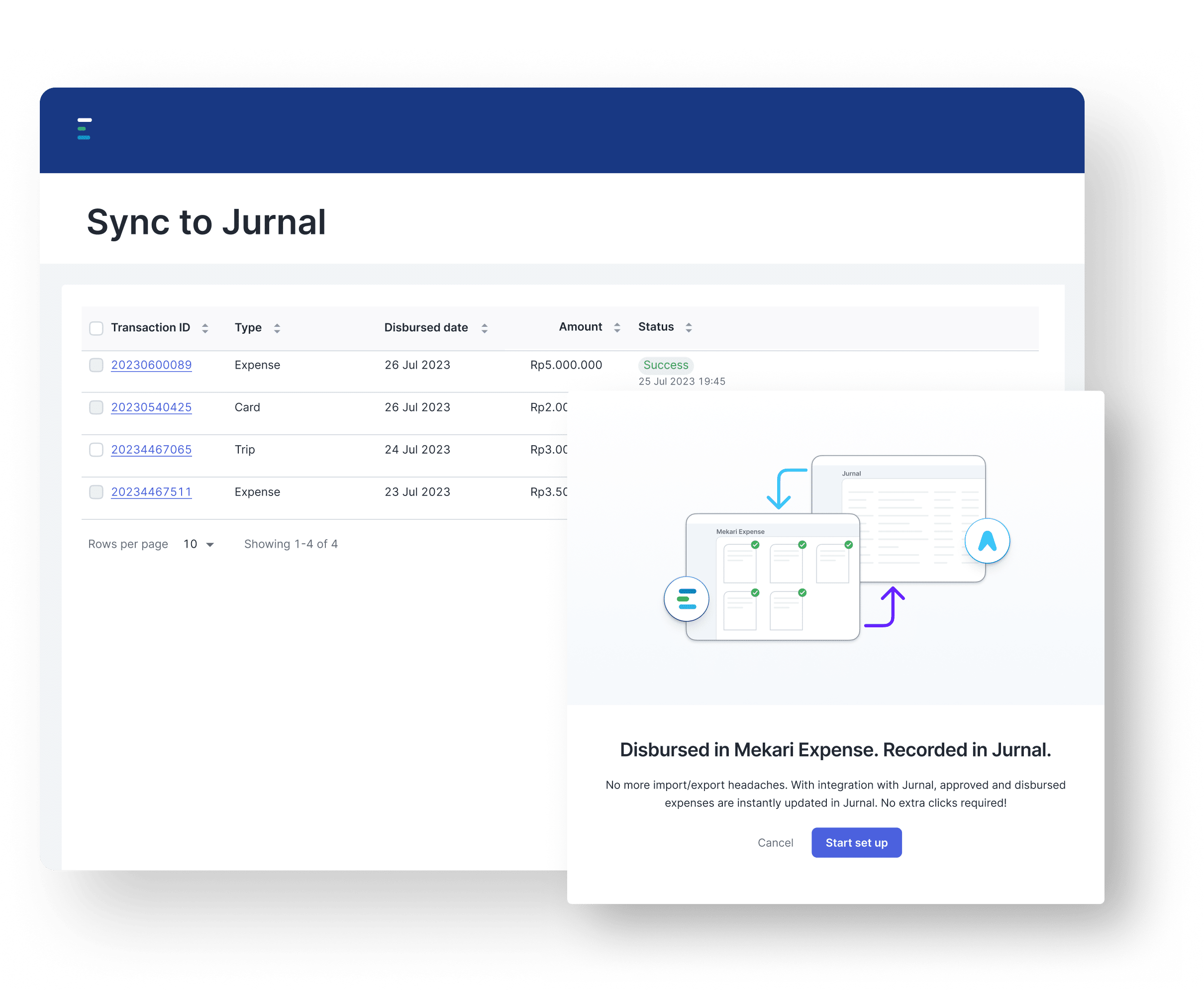 Integrasi antara Mekari Expense dan Mekari Jurnal memastikan seluruh proses cash advance tercatat secara menyeluruh.