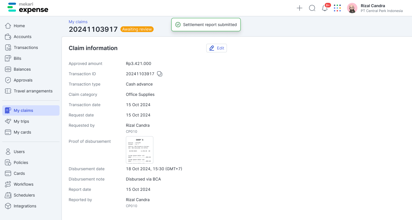 Setelah pengajuan disetujui, dana dicairkan dan langsung tercatat dalam sistem. Melalui integrasi dengan Mekari Jurnal, transaksi cash advance tersebut otomatis masuk ke pencatatan keuangan, sehingga tim finance sudah memiliki visibilitas terhadap dana yang keluar sejak awal.