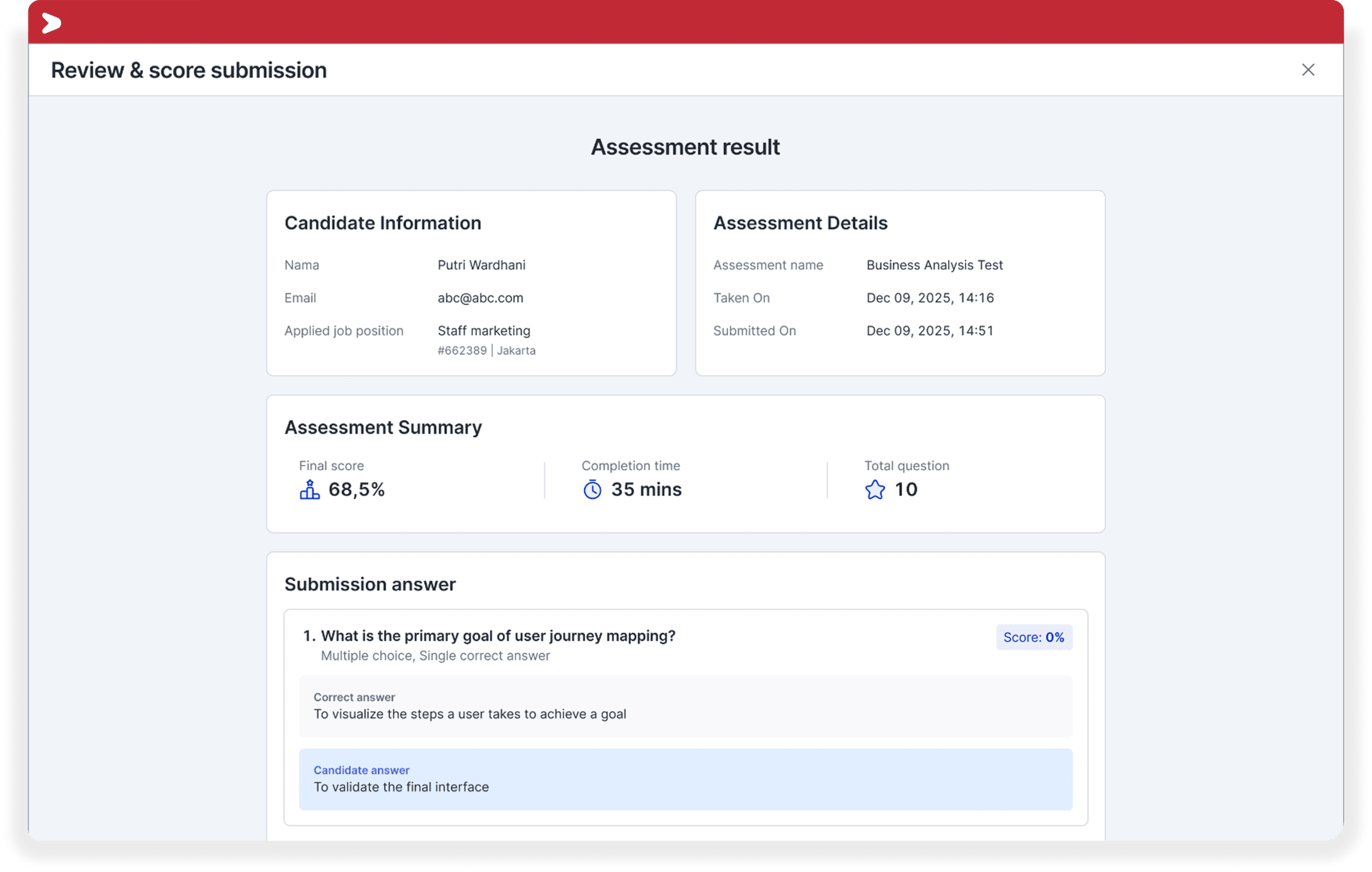 Lihat skor dan jawaban kandidat untuk memahami hasil assessment secara lebih detail.