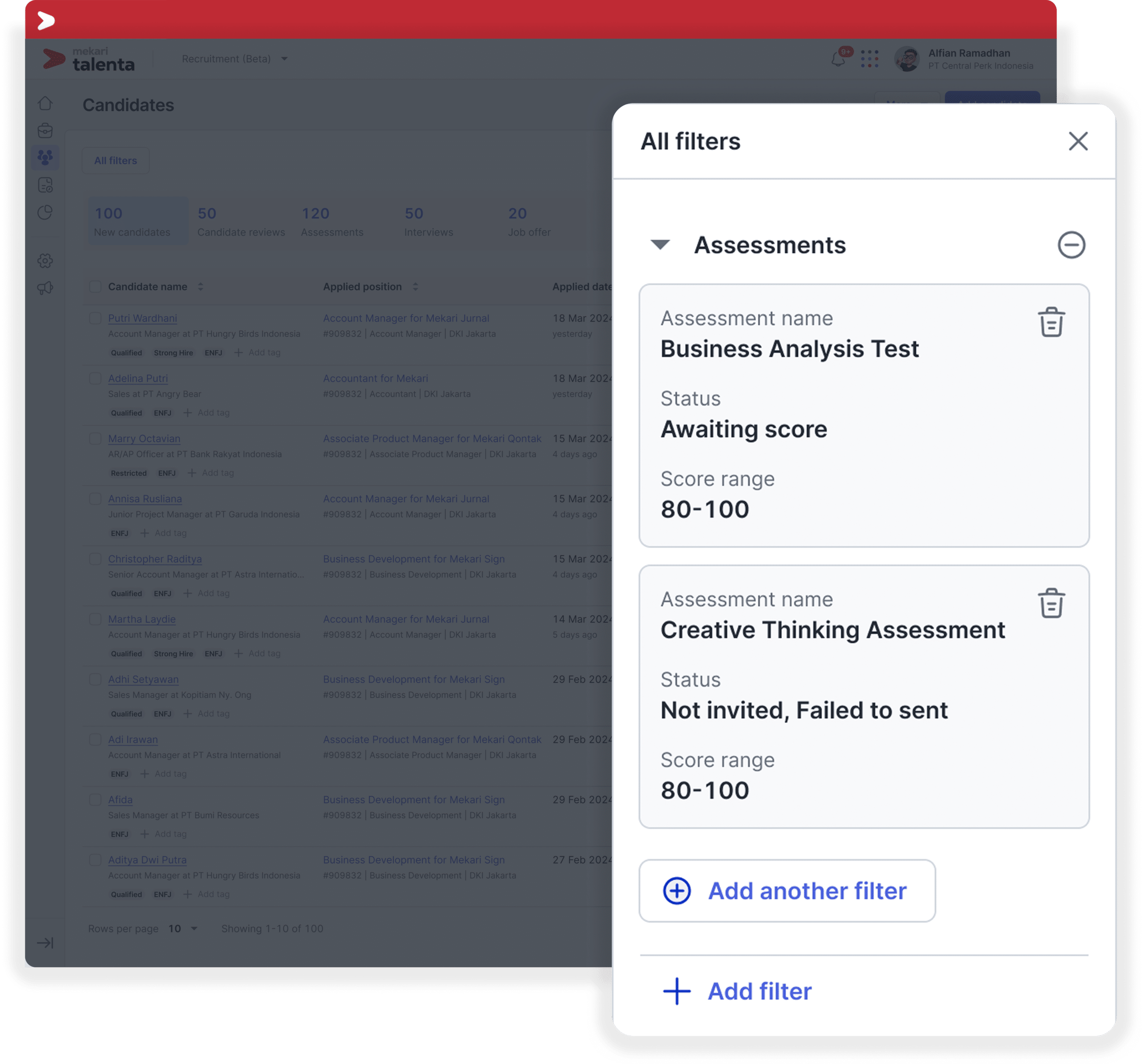 Filter kandidat berdasarkan assessment dan hasilnya untuk mempermudah proses seleksi.