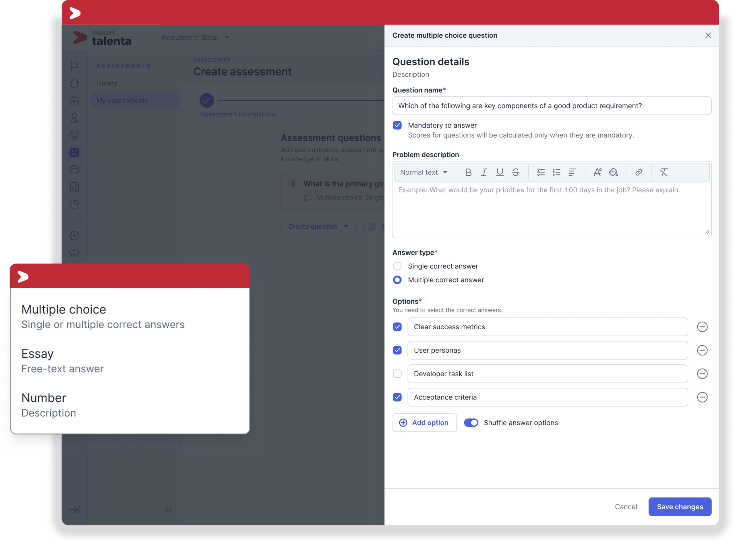 Buat assessment dengan tipe pertanyaan dan jawaban yang dapat disesuaikan berdasarkan kebutuhan hiring.