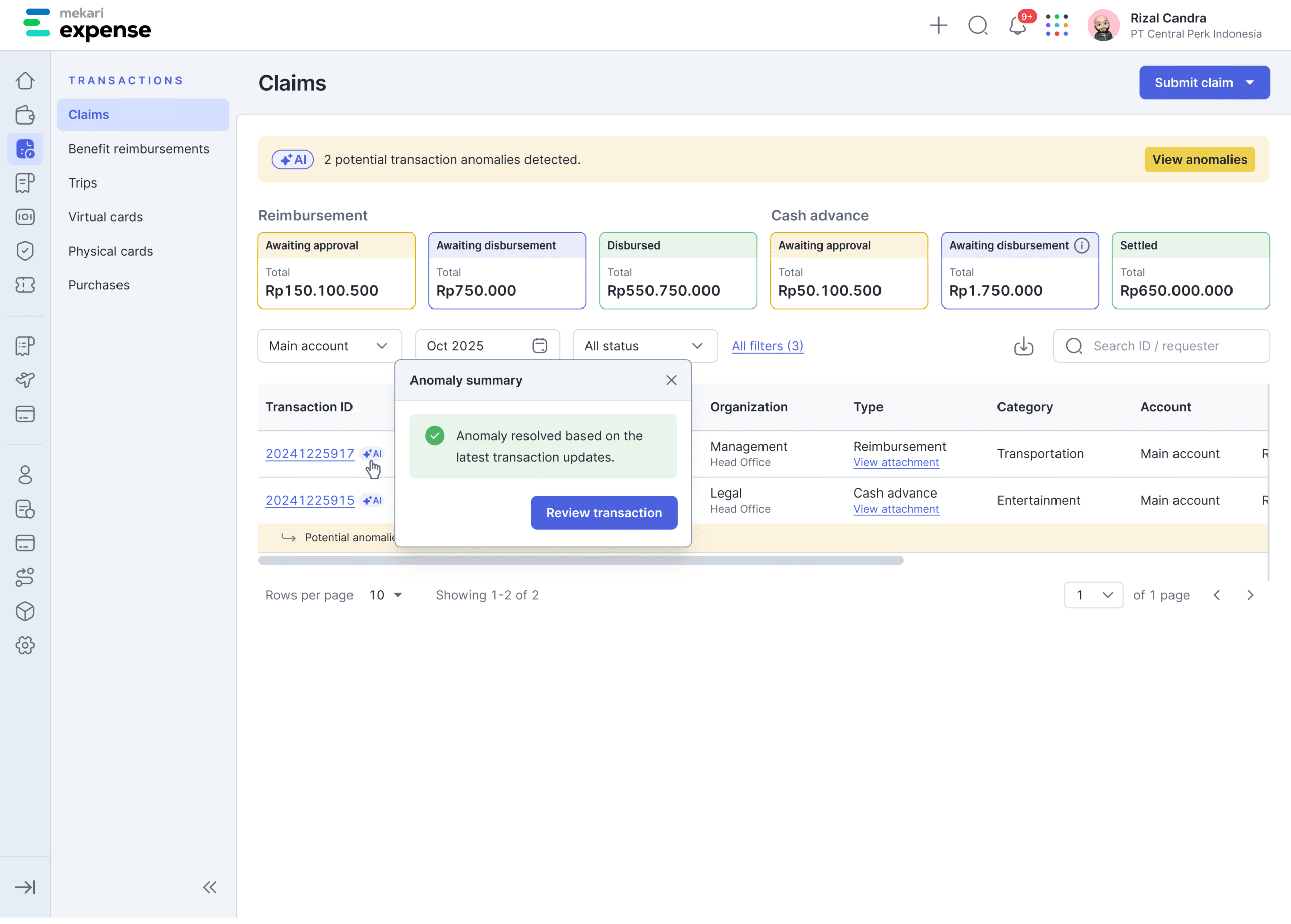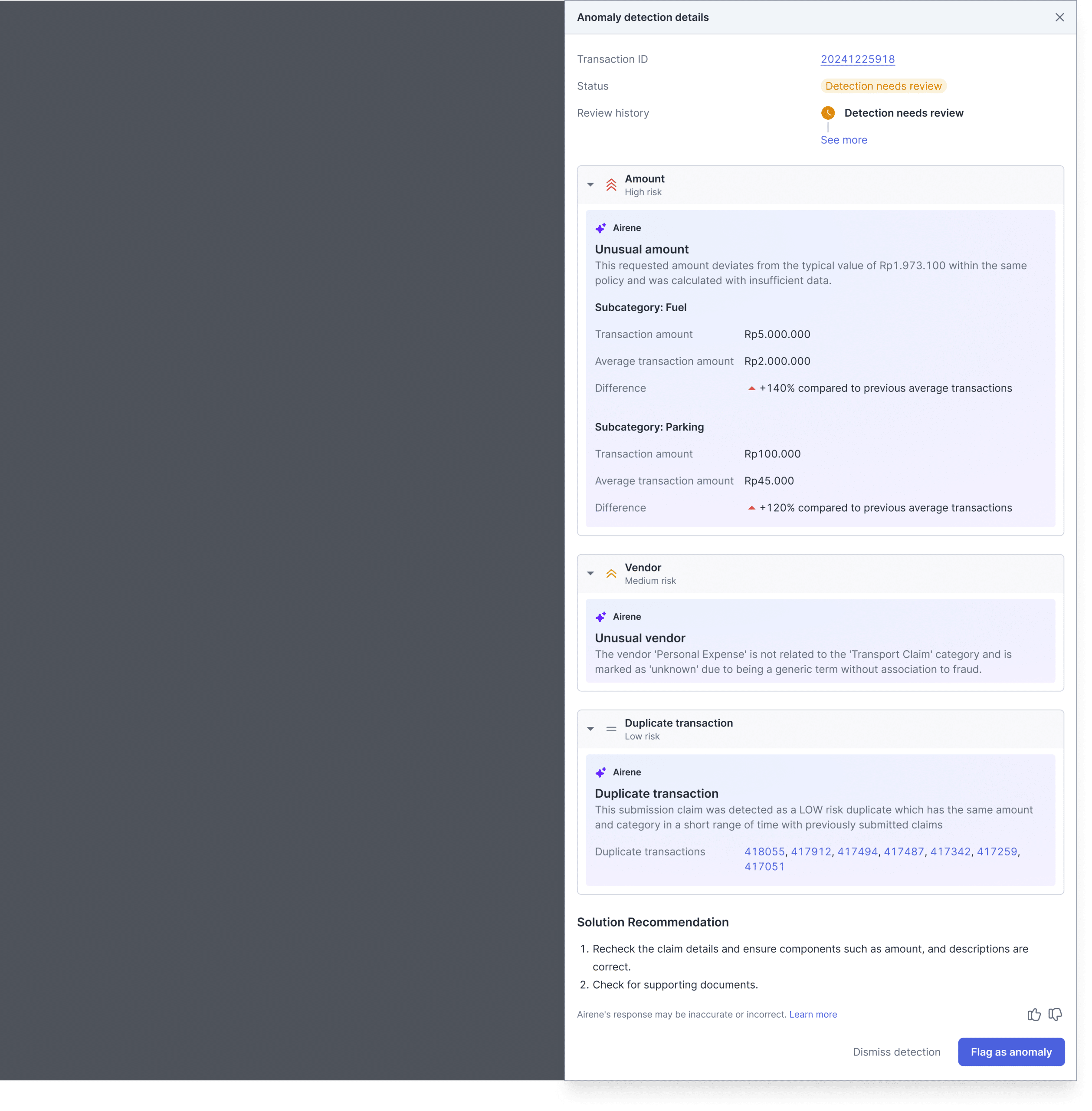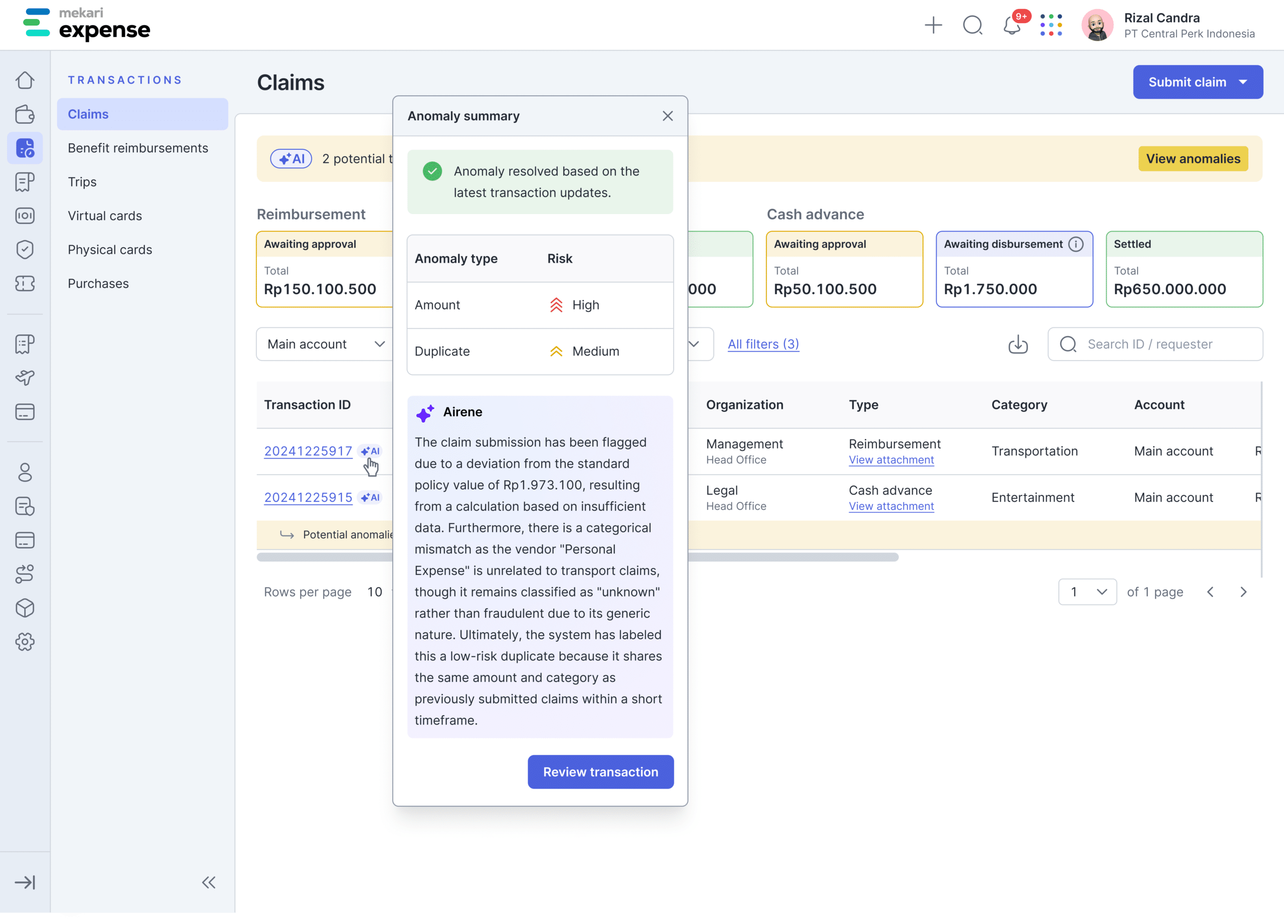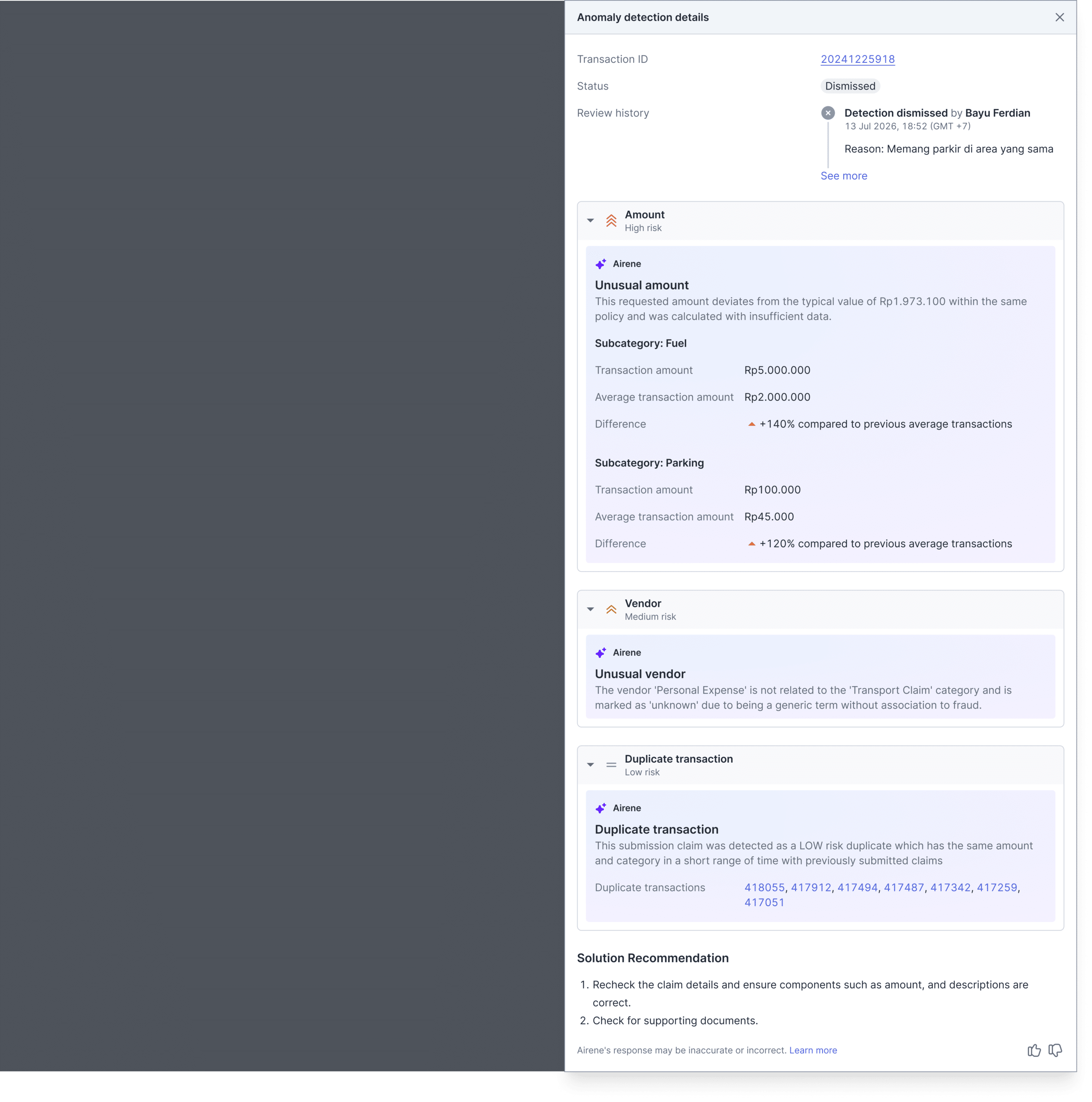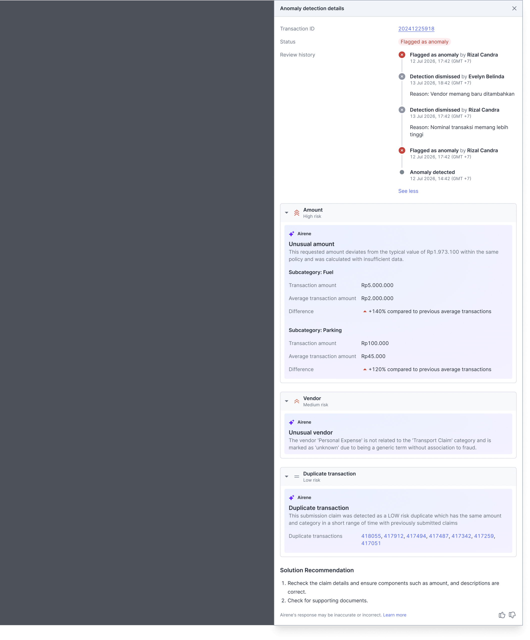 Melalui Mekari Expense, fitur AI fraud detection membantu menganalisis setiap pengajuan dan memberikan indikasi risiko secara langsung saat proses berlangsung.