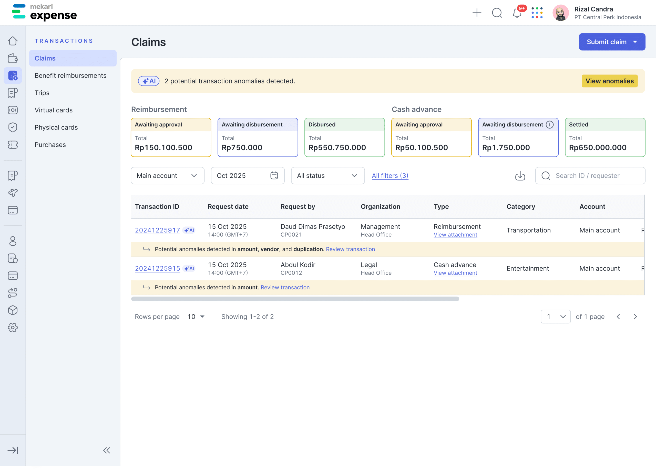 Gunakan Mekari Expense untuk membantu proses reimbursement yang lebih terintegrasi sekaligus memudahkan tim dalam mengidentifikasi klaim yang berpotensi tidak sesuai.