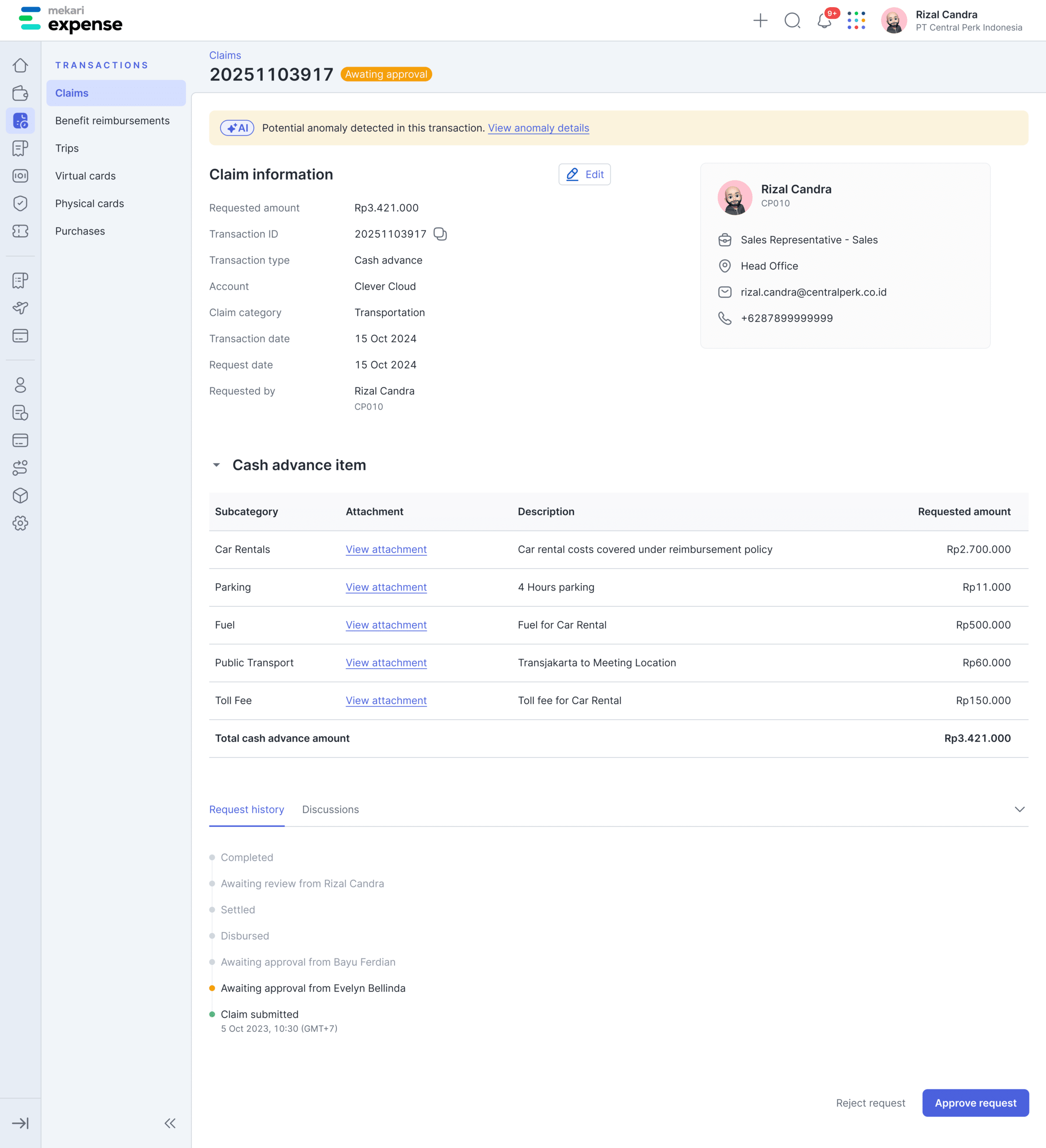 Bayangkan seorang karyawan mengajukan reimbursement untuk kebutuhan operasional.