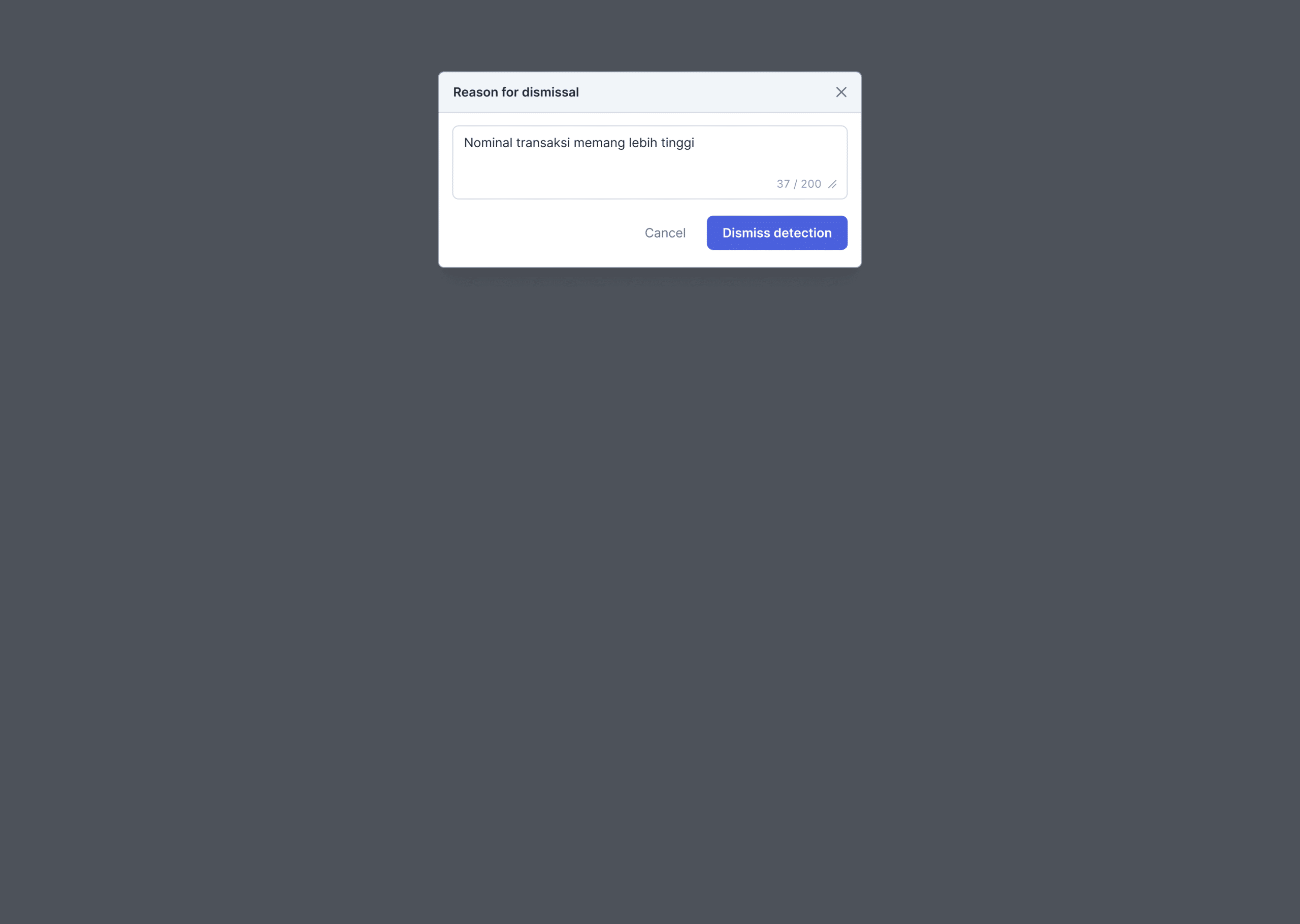 Detail analisis dapat diakses pada halaman transaksi, yang menampilkan jenis anomali, tingkat risiko, serta penjelasan yang mendasari deteksi.